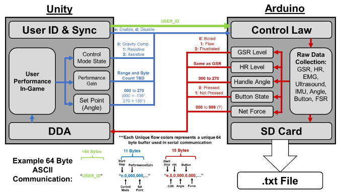 In addition to the Dynamic Range adaptation that the SUKI extensions provide, a novel Haptic Biometric Based Dynamic Difficulty Adjustment HBB-DDA system was added which serves several functions on both the game side (difficulty and feedback) and the robotics side (adapting the assistive/resistive forces experienced by the patients). This requires flexibility to adjust either/both game difficulty as well as robotic assistive/resistive difficulty based on user capabilities (motor and cognitive), performance (e.g., game score, etc.), and therapist settings (parameters).